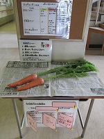 今日は、葉付きの立派なにんじんをいただいたので、食材紹介コーナーに展示をしました。