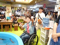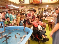 朝市では、イカ釣りを体験し、釣りたてのイカを味見。