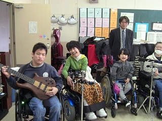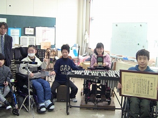 平成7年度、当時の高等部3年生が「桐が丘祭(文化祭)で演奏したい」と自ら企画したのがきっかけで始まった演奏活動(バンド部)ですが、その後も活動したいという生徒は途絶えることがなく、20年の歳月が流れています。今年度は、五嶋みどりさんのミュージック・シェアリングのご支援があって、サントリーホールの舞台に立つこともできました。 現在、入学式の「歓迎の歌」の伴奏のために練習をしています。この日は、表彰を記念して、記念撮影をしました。3年生が卒業したので現在は1・2年生8人で活動しています。4月に新1年生を迎えるのが楽しみです。
