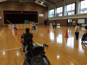 写真は体育の様子です。スラロームという競技の体験をしています。
