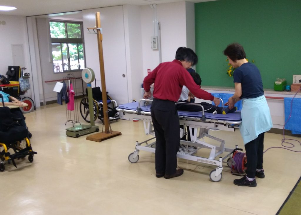 ストレッチャー型とは、どんなものかと興味津々でのぞいてみた。車いすにのった子供たちの前に、ストレッチャーがある。一人の先生が子供の上半身を抱え、もう一人の先生が子供の膝の辺りを抱え「ヨイショ」とストレッチャーにのせる。先生は、ストレッチャーの横に回って何かを見て、「24.7kg。ちょっと増えたね。」と言う。体重測定が終わったようだ。