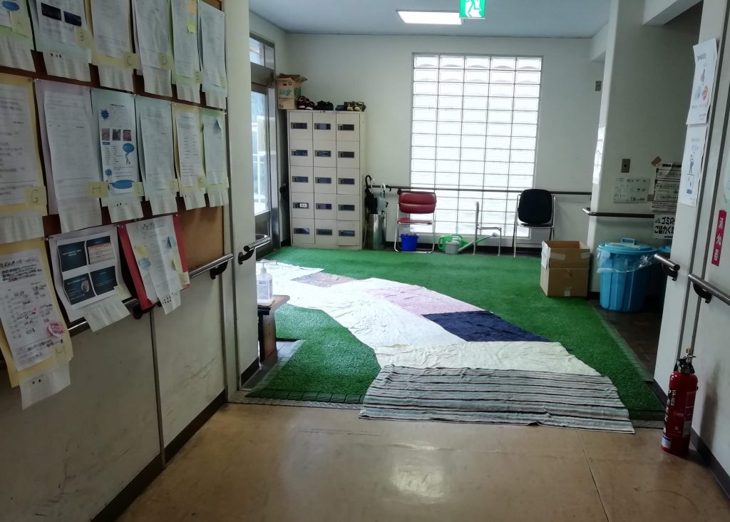 校舎を回っていると、高等部棟の3階にある洗濯機の前で介助員のOさんが大きな洗濯物と格闘している。まだ、朝だというのにどうしたことだろうと思って聞いてみると、玄関に敷いているシーツやマットだとのこと。そう言えば、学校再開後の玄関には5mほどシーツやタオルが敷き詰められている。